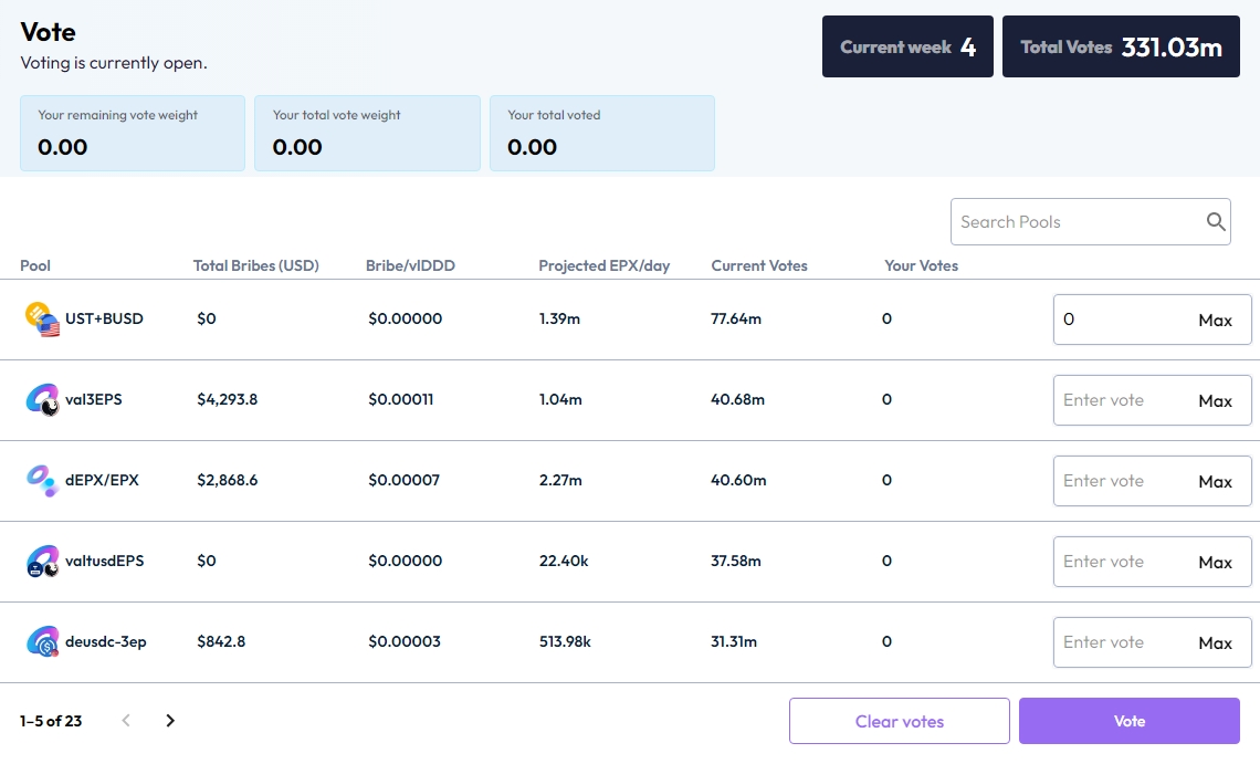 Enter the number of votes you would like to cast from the total amount of votes and press on "Vote". Voting is done weekly during epochs that last for 72 hours, a new epoch starts every Monday 00:00:00 UTC, and finishes every Thursday 00:00:00 UTC.